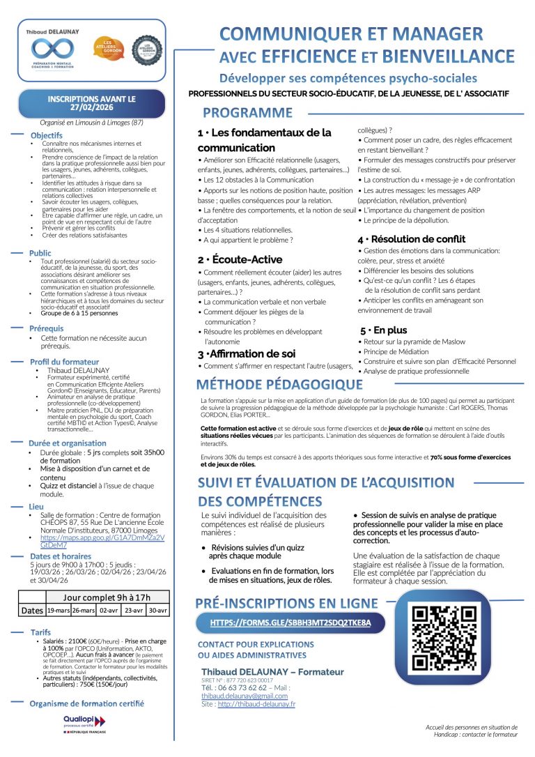 - Commentaires fermés sur Zone Limousin (87-Limoges) en 2026 : Formation communiquer et manager avec efficience et bienveillance pour les professionnels du secteur socio-éducatif (CS, EVS, ACM, associations, périscolaire, clubs…), de mars à avril 2026